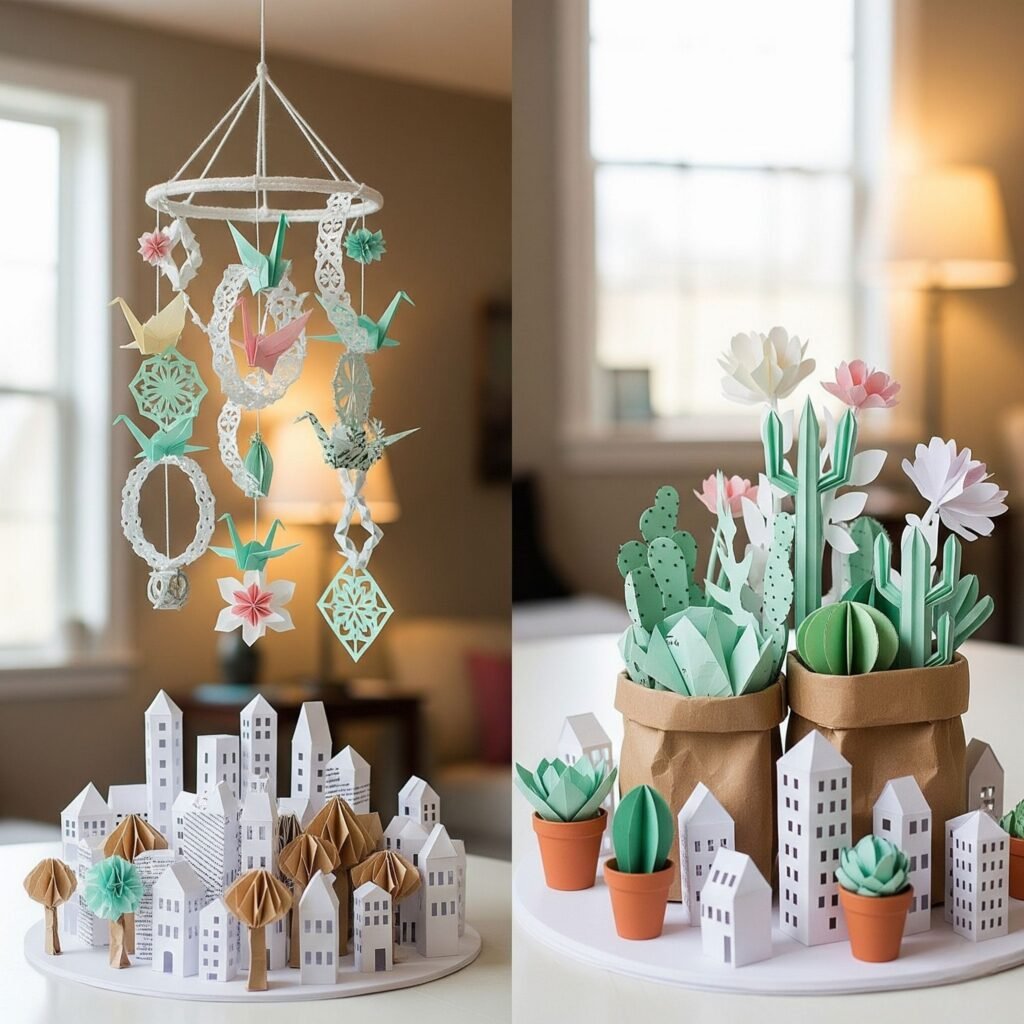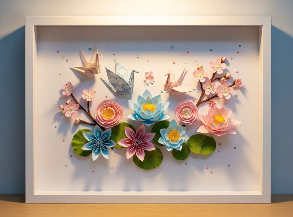 The central element is a large, multi-layered paper flower in pink and yellow hues, with rolled paper strips forming the center and petals.