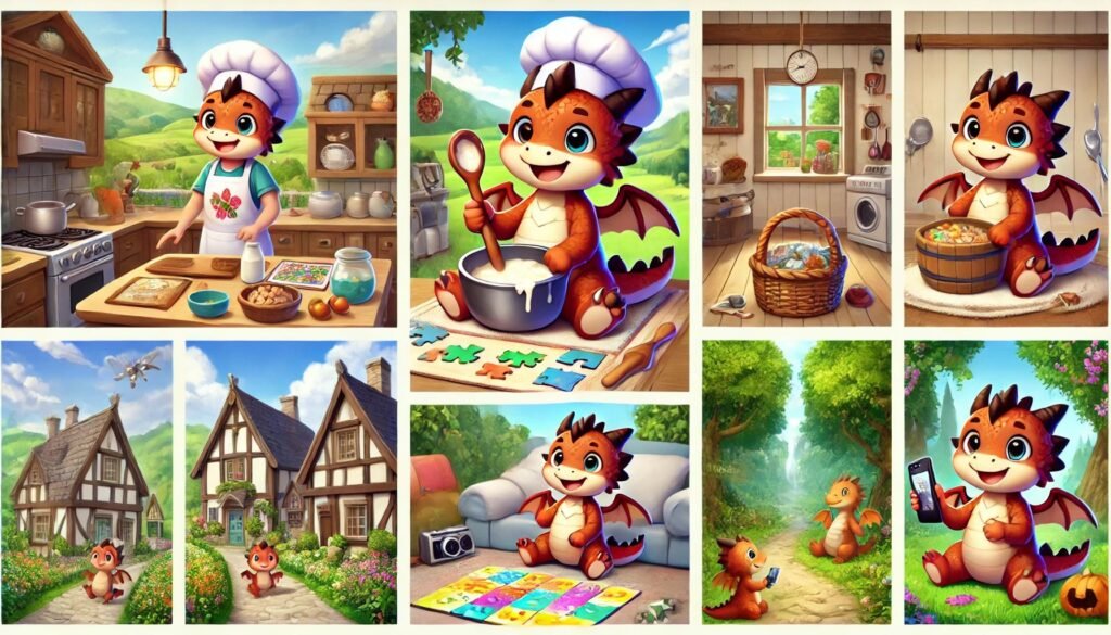 The dragon character appears in different scenarios, including cooking in a kitchen, playing with a puzzle, relaxing on a couch, and exploring outdoors.